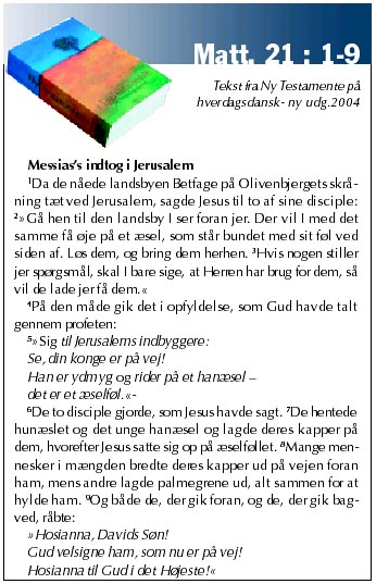 Det har altid undret mig, at evangelisterne bruger så meget spalteplads på beskrivelsen af føllet, som Jesus red ind i Jerusalem på. Johannes fortæller i sit evangelium om, hvor udfordrende redigeringen af Jesus-stoffet var. Han mener ikke at hele verden kunne rumme alle de bøger, som måtte skrives, hvis alt om Jesus skulle gengives helt og fuldt (Joh.21:25). Det har ikke været let at vælge og vrage. Godt at evangelisterne havde Helligånden til hjælp.