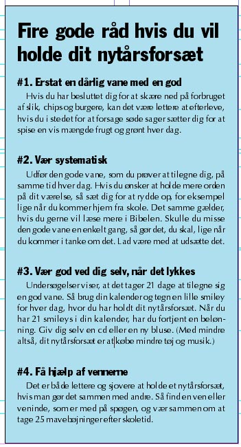 I 2005 skal smøgerne slukkes, og julemaven løbes væk. Jeg vil sladre og bagtale mindre og være en bedre kammerat end i 2004. Bedstemor skal have flere breve, og så skal der bruges meget mere tid på tyske stile, bøn og bibellæsning.