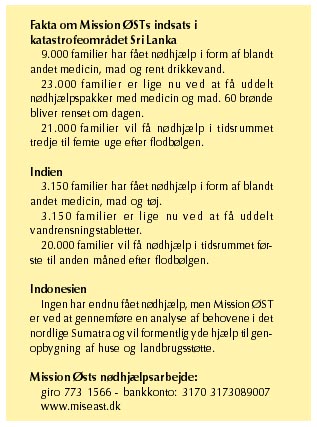 – Opbakningen fra vores danske givere har været fænomenal, og vi er taknemlige for hver eneste gave, vi har fået, siger generalsekretær for Mission ØST, læge Kim Hartzner. – Men vi må ikke glemme, at katastrofen i Asien ikke er den eneste krise på jordens overflade. Kriser som dem i Afghanistan, Darfur og Irak, der hver dag koster menneskeliv, må ikke blive overskygget af naturkatastrofen. Det gælder om at hjælpe alle – også dem, der lider uden for mediernes søgelys – så ingen bliver ladt i stikken, fastslår han.