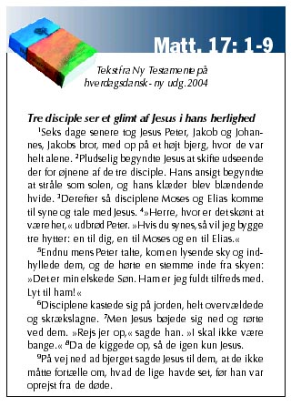 – Der var en grund til, at det netop var de tre disciple, Jesus havde taget med op på bjerget. De var ledere i gruppen, og de skulle have en personlig erfaring af Jesus som Guds søn forud for det, som skulle til at ske med Jesus. De havde brug for en dybere forståelse af Jesus, inden de skulle se ham blive pint, plaget og hængt op på et kors for at dø.