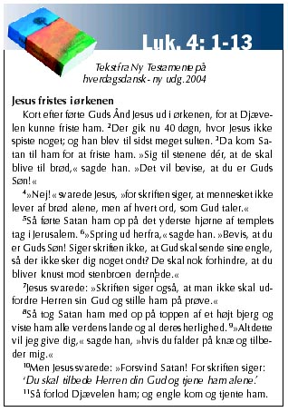– Prøvelser og fristelser kalder disse værdier frem i os. Hvad er det egentlig, vi værdsætter. Satser vi på den kortsigtede jordiske behovstilfredsstillelse eller de evige himmelske værdier. Jesus afviser Djævelen. Det er ikke brød, der gør et menneske lykkeligt. Mennesket lever ikke af at blive mæt i denne verden, men af Guds ord. I 5. Mos 8,2-3 siger Gud: jeg lod jer sulte for at se, hvad der boede i jer, om I vil holde jer til mig.