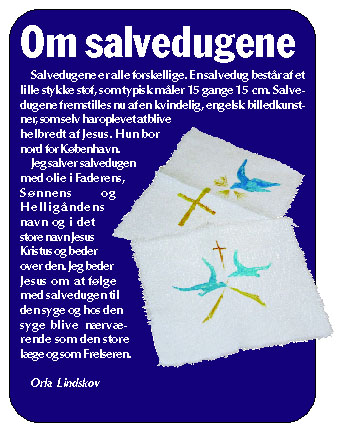 Kræftlægen spurgte mig flere gange om, hvad jeg havde gjort. Jeg sagde, at jeg havde været til forbøn hos seks forskellige helbredelses-prædikanter. Bl.a. hos Orla Lindskov i Lemvig Kristent Center i 2003 og i Trandum ved Skive i 2004. Efterfølgende tilsendte Orla Lindskov mig en salvedug.
