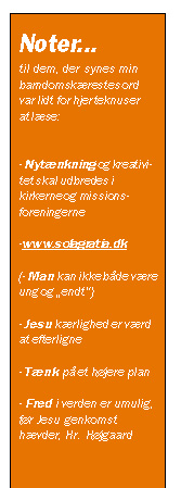 Kreativitet og nytænkningI sidste afsnit af Mission Fred på Jorden blev vi klogere på, hvad aktiv omsorg kan gå ud på. Den feminine århusianer kom med et glimragende bud på hvilken motivation der må ligge til grund for kristne projekter, nemlig Jesu uendelige kærlighed til alle mennesker, og desuden udelukkede hun, at penge kan føre til fred på jorden.