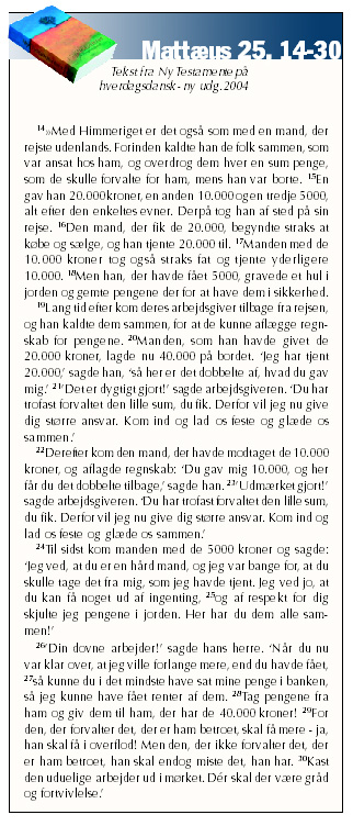 Jesu lignelse siger, at livet er et talent, vi har fået af Gud. Det leves kun én gang, så vi har pligt til at forvalte det med største omhu – ikke blot for os selv, men for vores næste. Vi skal med al vor energi stræbe efter at leve et virksomt liv, så vi er i stand til at tage vare på os selv og vore nærmeste. Vi skal dreje vores indsats i en retning, så vort liv kommer flest mulige medmennesker til gavn. Jeg skal overveje og beslutte, hvordan netop jeg er i stand til at gøre en forskel igennem mit liv og væremåde.