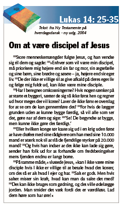 Hver gang jeg læser denne tekst, får jeg en dårlig smag i munden, fordi Jesus inviterer mig til at hade mig selv, hvis jeg vil følge ham. Det lyder så hårdt og så svært. Og jeg har lyst til at springe denne tekst over. Det ligner slet ikke den Gud, jeg elsker. Måske har jeg misforstået noget. Betyder teksten virkelig, at jeg skal hade mig selv? Eller betyder at hade noget andet i denne sammenhæng?