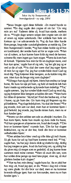 Til sidst går han hjem til sin far og bliver modtaget med åbne arme og en stor fest. Men hans storebror vil ikke deltage i festlighederne. Han mener ikke, at hans fortabte lillebror har fortjent sådan en velkomst.