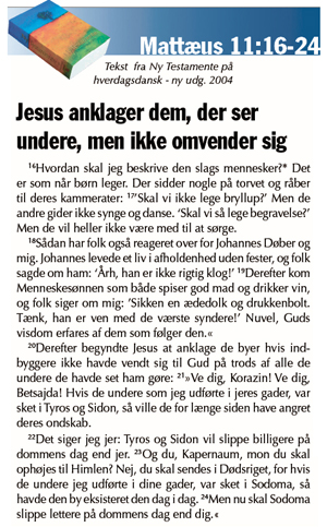 Jesus taler dom i dagens tekst. Tydeligt og radikalt. Han vil have smagsdommerne ud af tilskuerrollen og have dem til at lytte med hjertet. Men de vil hverken lytte til Johannes Døbers kald til omvendelse og selvransagelse eller til Jesu forkyndelse af nåde og tilgivelse. De vil kun være tilskuere, selv om de har været vidner til et utal af barmhjertighedsgerninger, som netop viser, at Jesus er i Guds tjeneste. Derfor lader Jesus dommen falde som en følge af, at de ikke havde ladet sig omvende.