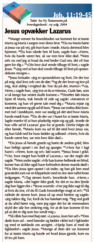 – Han er ikke død for mig, Martha. Verden er større end din lille verden. Tilværelsen er mere end den korte tilværelse her. Det her sker for at I skal se og tro, at jeg er Opstandelsen og Livet, og at I får evigt liv ved at tro på mig!