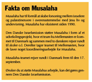 – I min tid i hæren var jeg i et frygteligt dilemma. Jeg vidste, det var min pligt som kristen at elske min fjende, men hvordan skulle jeg kunne gøre det, når de allerhelst så, at jeg faldt død om? Efter hæren tog jeg til England på bibleskole for at forsøge at finde svar på nogle af de spørgsmål, jeg havde. Da jeg kom hjem til Israel igen, hørte jeg om Musalaha og meldte mig til en af deres ture, og der mødte jeg palæstinensere, der ikke ønskede mig død, men faktisk elskede mig. Det var fantastisk, slutter Michael.