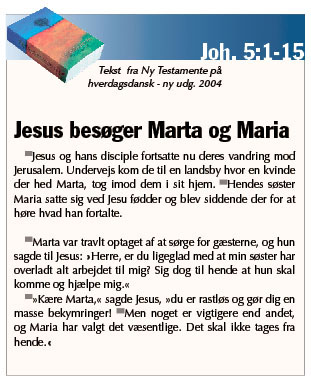 »Kære Martha,« sagde Jesus, »du er rastløs og gør dig en masse bekymringer! Men noget er vigtigere end andet, og Maria har valgt det væsentlige. Det skal ikke tages fra hende.« (Lukasevangeliet 10,40-42)