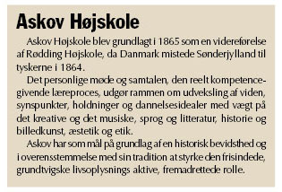 Askov Højskole i Sydjylland blev grundlagt i 1865 som en videreførelse af Rødding Højskole, da Danmark mistede Sønderjylland til tyskerne i 1864. Askov Højskole fik stor betydning for dannelsen af den danske nationale, kulturelle, politiske, økonomiske og ikke mindst – kristelige identitet.