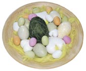 De blev tilsat nogle gule fjer og et nyindkøbt grønt æg. De små kulørte æg er Anton Berg marcipanæg.
