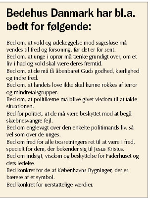 Bedehus Danmark er et netværk af kristne fra forskellige kirkesamfund, der beder 24 timer i døgnet for aktuelle emner. Her har konflikten om Ungdomshuset på Nørrebro været et akut og seriøst bønneemne i en længere periode, fortæller Lene Knudsen fra initiativgruppen i Bedehus Danmark. Hun har været med til at udarbejde en liste over bedeemner (se tekstboks).