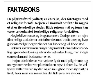 på en pilgrimsvandring og retræte.Over 100.000 pilgrimme fra hele verden tilbagelægger hvert år den over 750 kilometer lange pilgrimsvej, Caminoen, fra Pamplona til Santiago i det nordvestlige Spanien. For dem, som ikke har tid, økonomi eller fysik til at tilbagelægge så mange kilometer til fods, tilbyder flere rejseselskaber rejser, der kombineret med kortere daglige vandringer følger den berømte pilgrimsvej. Rejserne giver en smagsprøve på en pilgrimsvandring.