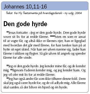 Jesus fortsatte: »Jeg er den gode hyrde. Den gode hyrde vover sit liv for at redde fårene. (Johannes-evangeliet 10,11)