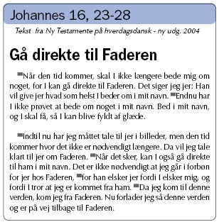 Beder I Faderen om noget i mit navn, skal han give jer det, lover Jesus. At bede Gud om noget i Jesu navn er det samme som at lægge sit liv i Guds hånd og tro på, at han ved bedre, end vi gør, hvad der er bedst for os.