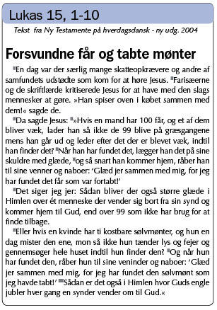 Toldere og syndere holdt sig i nærheden af Jesus for at lytte til hans forkyndelse. Og det var en forargelse for den tids fromme. Tilhørerne var ikke et øjeblik i tvivl om, hvem der var det mistede får. For det er netop den mislykkede, den, der ikke lever op til Guds standard, og som ved, at han eller hun er kommet væk fra Gud, der ligger Jesus på hjerte i dagens tekst.