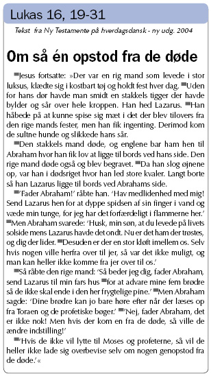 Men også det ønske svares der nej til. Hvis de ikke hører Moses og profeterne, vil de heller ikke lade sig overbevise, selv om en står op fra de døde.