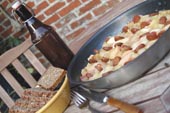 Nu vel, denne blanding er frisk og lidt syrlig og passer godt til den lidt tørre dej i pien, så det, som i første omgang blev sat sammen i mangel af bedre, er nu blevet til en gentagen succes.