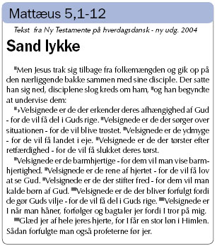 Det står i skærende kontrast til farisæernes lykkebegreb, og til vores. Vi lader almindeligvis, som om lykken, som vi så forveksler med saglighed, er: succes, prestige, magt, klogskab, sundhed, økonomi, hus og rejser.