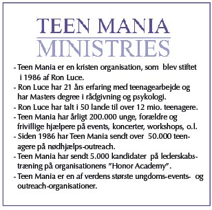 Teen Mania inspirerer og motiverer teenagere over hele verden til at gribe sandheden om Jesus, stille spørgsmålstegn ved pop-kulturen og dele Guds budskab om håb og anerkendelse med deres generation.