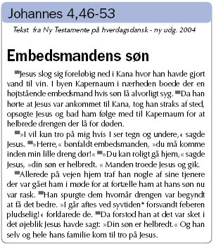 Vi får ikke nødvendigvis den slags beviser, men det er også mindre vigtigt, for troslivet begynder ikke i beviset, men netop i troen. Embedsmanden begyndte ikke at tro, da han så, at sønnen var rask. Han troede fra det øjeblik, Jesus sagde: Gå hjem, din søn lever. Hans tro var fast tillid til det, han håbede på, men endnu ikke havde set.