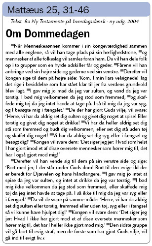 Den kærlige Gud er i allerhøjeste grad at finde i Jesu fortælling om dommedag. Få steder i Bibelen oplever vi så tydeligt, at Jesus står på de svages og de lidendes side. Deres smerte er hans smerte.