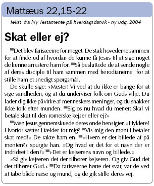 Jeg kom endvidere til at tænke på dagens beretning, hvor Jesus fik stillet spørgsmålet: Er det tilladt at give kejseren skat? Der er formentlig tale om den skat, som hvert år skulle betales for hver person uanset indkomst. Beløbet var en denar, svarende til en dagløn.