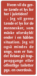 – Støt de frivillige organisationer, som arbejder med socialt udstødte i Danmark – både økonomisk og politisk. Der ville mangle noget, hvis ikke vores 30 frivillige var der, hvis ikke Kirkens Korshær eller Frelsens Hær var der.