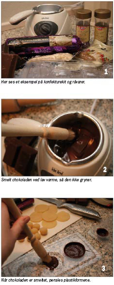 På illustration 1 er der et eksempel på det kit, man skal bruge til konfekture. En chokoladekoger, råmarcipan, nougat, tre slags chokolade, krymmel, nødder og chokoladeforme i plastik.