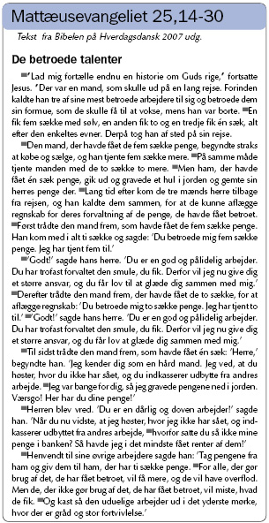 Hvad er det, som Gud lægger på vægten? Hvad vejer så tungt, at det kan opveje alle vore synder? Det gør han, som fortæller os historien om de betroede talenter, han, uden hvem denne historie ville være alt for slem, Jesus Kristus. Ham blev alt betroet på korset. Han risikerede alt. Han led og døde og genopstod. Han tjente nok til at slette de røde tal i vores regnskab med Gud, således at vi, som ellers blot fortjener at blive kastet ud i mørket udenfor, alligevel kan gå ind til vor Herres glæde.