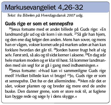 - Teksten handler for mig om Guds rige og det mysterium, der opstår omkring Kristus. Markus har bevidst skrevet sit evangelium lige som en kriminalroman. Fra starten af får vi mysteriet at vide: At Jesus er Guds søn. Spændingsmomentet i hele krimien er så, hvordan det hele optrævles. Allerede i