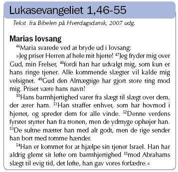 Maria kan ikke lade være med at synge. Vi kender det fra os selv. Når vi oplever noget, stærkt og dybt, bobler vi over af glæde, og bristefyldt af det alt sammen bryder vi ud i sang. I tak og sang til Gud. I lovsang til vor Herre og frelser som tak for livet og det gode, der overgår os. Det er måske værd at bemærke, at ordet lov, som vi anvender i ordet lovsang, stammer fra tysk og betyder noget i retning af bifald eller tilfredshed.