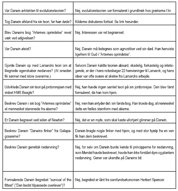 Næste år er det 150-året for Darwin, og der vil blive holdt mange skåltaler, og lovprisningerne af Darwin vil nå nye højder. Nogle gange slipper lovprisningerne jordforbindelsen og bliver til myter. – Test din viden om Darwin.