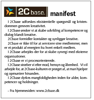 – 2Cbase er mennesker, der interesserer sig for kristendom og kreativitet, som mødes, fordi de har et fælles interessefelt. Vi skaber kontakter.