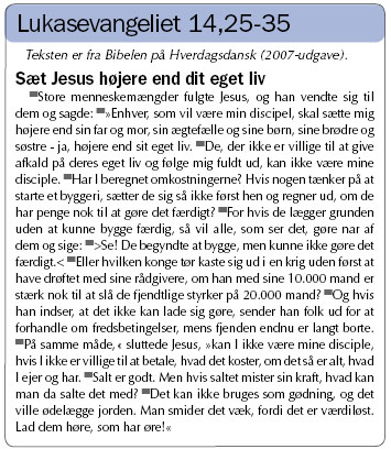Men er det ikke lovlig meget ligefrem at hade sin far og mor og kone og børn? Jo, naturligvis, men i hebraisk sprogtradition elsker man at bruge yderligtgående ord for at slå en ting fast med syvtommersøm. Det er et spørgsmål om prioriteter. Derfor oversætter Bibelen på Hverdagsdansk det som: Enhver, som vil være min discipel, skal sætte mig højere end sin far og mor, sin ægtefælle og sine børn, sine brødre og søstre – ja, højere end sit eget liv. Hvis din far eller mor modsætter sig dit ønske om at følge Jesus, hvad er så vigtigst?