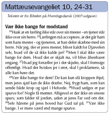 Situationen er anderledes, hvis vi som disciple af Jesus åbent efterlever den lære, som de tolv disciple bragte til de første kristne menigheder, og som langt senere kom til Danmark. I dette tilfælde har fortsættelsen af Jesu ord fuld mening. De handler om frygt, vel og mærke med negationen, frygt ikke. Trods modstand fra intellektuelle ateister og trods den anti-religiøse trend i det offentlige rum, så har vi intet at frygte, for Gud er med os.