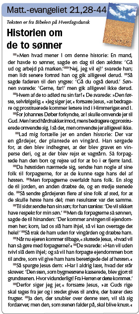 Svaret i Jesu lignelse er fyldt af håb. Håbet kommer fra vingårdsejerens søn, som blev sendt til vinbønderne. Da Jesus døde, blev han henrettet på grund af de mure, som vi bygger op mellem os og Gud og mellem os og vores medmennesker. Jesus kom med Guds kærlighed og Guds kærlige ord til os. Ordene om at elske Gud og vor næste. Men vi vinbønder har travlt med at hyppe vores egne kartofler. Og det preller af på vores mur. Derfor er Golgata dommens sted. Hvor vi må svare vingårdsejeren, Gud: Ja, sådan handler vi.