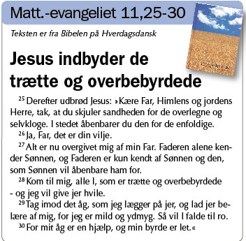 Jesus sagde: Kom til mig, alle I, som slider jer trætte og bærer tunge byrder, og jeg vil give jer hvile. Tag mit åg på jer, og lær af mig, for jeg er sagtmodig og ydmyg af hjertet, så skal I finde hvile for jeres sjæle. For mit åg er godt, og min byrde er let.« (Matthæusevangeliet 11,28-30)