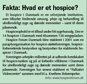 – Et hospice er det diametralt modsatte af et hospital, hvor det gælder om at få os raske og sendt hjem hurtigst muligt. På et hospice ved man, at alt lægeligt muligt er gjort allerede, og at det alene gælder om at gøre den sidste tid så god, som det er muligt både legemligt og sjæleligt.