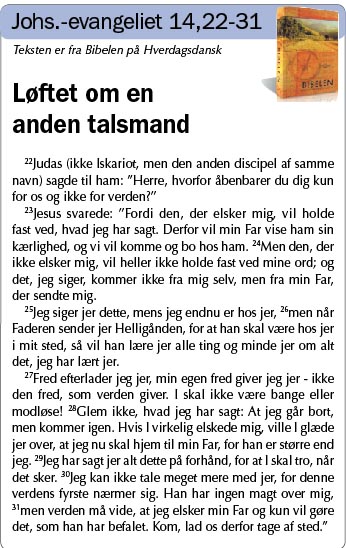 I al hemmelighed er der blevet konspireret en morderisk plan mod mesteren, Jesus (kap. 11). I dagens tekst er Jesus derfor gået i gang med at forberede sine efterfølgere på hans korsfæstelse og rejse tilbage til Himmelen.