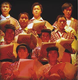 Det var et kinesisk minoritetskor fra Miaofolket, der skulle synge for os, og da vi så dem tabe deres nodeblade, vende hæfterne på hovedet og pille sig længe i næsen, havde vi publikummer indstillet os på at være venligt interesserede og imponerede af at et landsbykor, der alligevel var nået så vidt.