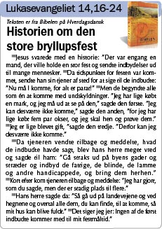 Kristendommen handler om fest, og meningen er, at de indbudte skal blive så glade for indbydelsen, at de går ud og forsoner sig med alle deres fjender, for det kan jo ikke være meningen, at man skal sidde til bords og være uvenner med nogen af de andre. Meningen er, at alle skal være glade og holde af hinanden.