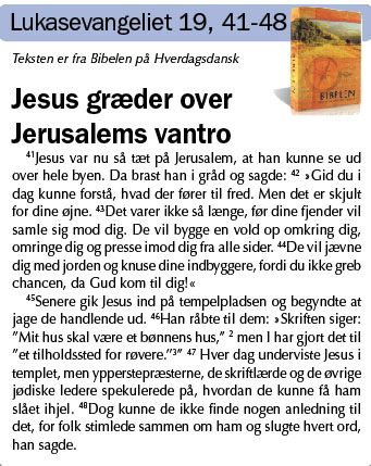 Jesus græder, fordi kærlighed altid græder, når den bliver afvist. Men Jesus bliver også vred. Da han finder ud af, at Jerusalem i sit hjerte, templet, ikke har plads til ham; ikke har plads til bøn og gudsdyrkelse, giver han sig til at jage vekselerere og handelsfolk med alle deres offerdyr ud af templet.