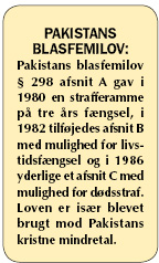Nazir S. Bhatti fra Pakistan Christian Kongres mener, blasfemiloven, der efter flere skærpelser siden 1980 giver mulighed for dødsstraf, legaliserer angreb på kristne fra grupper som Sipah-e-Sahaba.