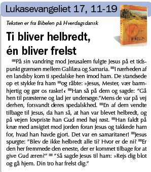 Og her er det ganske alvorligt, at Jesus ikke bare siger rosende til den taknemmelige samaritaner, at det var da pænt af ham – han siger: Din tro har frelst dig.