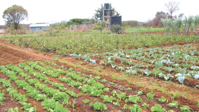 Lars Frederiksen – indehaver af vaskeriet Rula Måtteservice A/S mellem Hobro og Randers – følger spændt projektleder Julius Munganias rundvisning på markerne. Der dyrkes majs, kartofler og bananer, og selv så vandkrævende grøntsager som græskar, tomater og papayer ser ud til at trives i bedste velgående i et landskab, der mest af alt ligner en ørken.