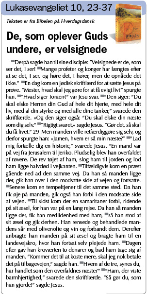 De irakiske asylansøgere er udstødt af deres gamle fædreland og nu også af Danmark, som de i 10 år har troet ville blive deres nye fædreland. De ligger dybest set i vejkanten og har brug for vores hjælp. Og skal jeg lære noget af samaritaneren, så er der ikke tid til hverken at spørge om navn, religion eller politisk ståsted. Jeg må bare hjælpe her og nu.