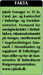 De Konservatives kristne kandidat i København, Jakob Næsager, mener, det hidtidige styre har været for religionsforskrækket.Jakob Næsager er formand for Missionsforbundets menighed på Amager, Bethelkirken, og stiller op til kommunevalget i København for Det Konservative Folkeparti.