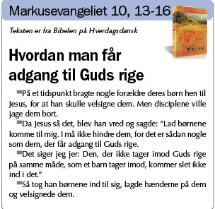 Det er indiskutabelt, at mange børn i dag savner ordentlig voksenkontakt. Især kontakt til deres fortravlede forældre. Men alle kan vi rette et opmærksomt blik på den opvoksende slægt, hvoraf de fleste er fremmede for Guds rige. Som kristne stilles vi overfor en stor udfordring, men også et godt eksempel i Jesus i dagens tekst. Hvor Jesus tilegner Guds rige til de børn, han tog i favn, lagde hænderne på og velsignede.